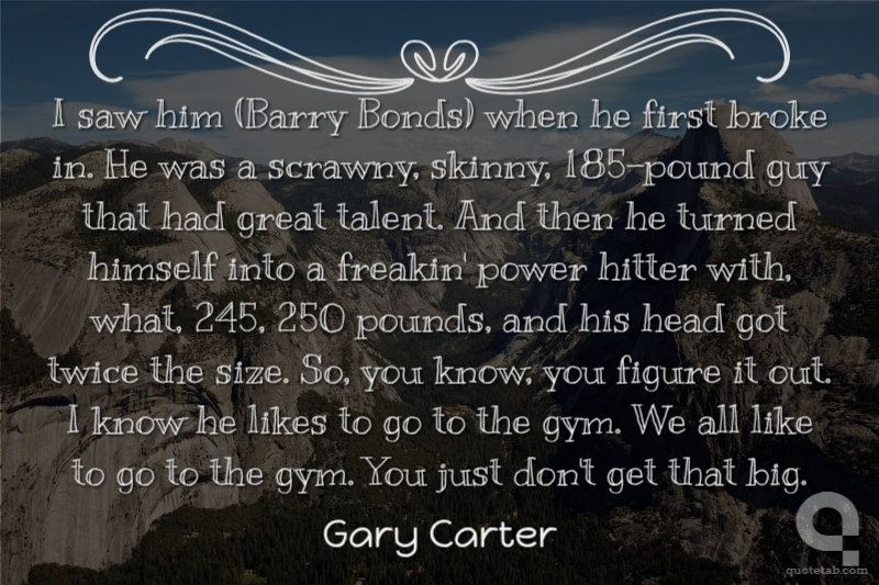 I saw him (Barry Bonds) when he first broke in. He was a scrawny, skinny, 185-pound guy that had great talent. And then he turned himself into a freakin' power hitter with, what, 245, 250 pounds, and his head got twice the size. So, you know, you figure it out. I know he likes to go to the gym. We all like to go to the gym. You just don't get that big.