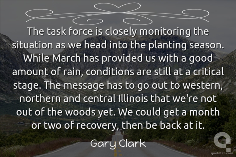 The task force is closely monitoring the situation as we head into the planting season. While March has provided us with a good amount of rain, conditions are still at a critical stage. The message has to go out to western, northern and central Illinois that we're not out of the woods yet. We could get a month or two of recovery, then be back at it.