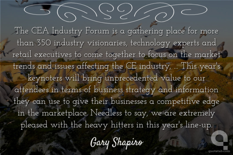 The CEA Industry Forum is a gathering place for more than 350 industry visionaries, technology experts and retail executives to come together to focus on the market trends and issues affecting the CE industry, ... This year's keynoters will bring unprecedented value to our attendees in terms of business strategy and information they can use to give their businesses a competitive edge in the marketplace. Needless to say, we are extremely pleased with the heavy hitters in this year's line-up.