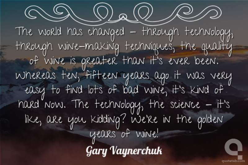 The world has changed - through technology, through wine-making techniques, the quality of wine is greater than it's ever been. Whereas ten, fifteen years ago it was very easy to find lots of bad wine, it's kind of hard now. The technology, the science - it's like, are you kidding? We're in the golden years of wine!