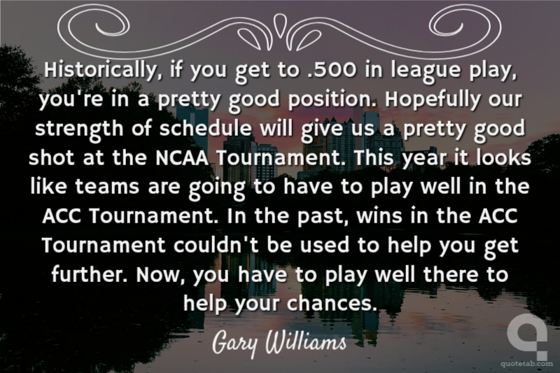 Historically, if you get to .500 in league play, you're in a pretty good position. Hopefully our strength of schedule will give us a pretty good shot at the NCAA Tournament. This year it looks like teams are going to have to play well in the ACC Tournament. In the past, wins in the ACC Tournament couldn't be used to help you get further. Now, you have to play well there to help your chances.