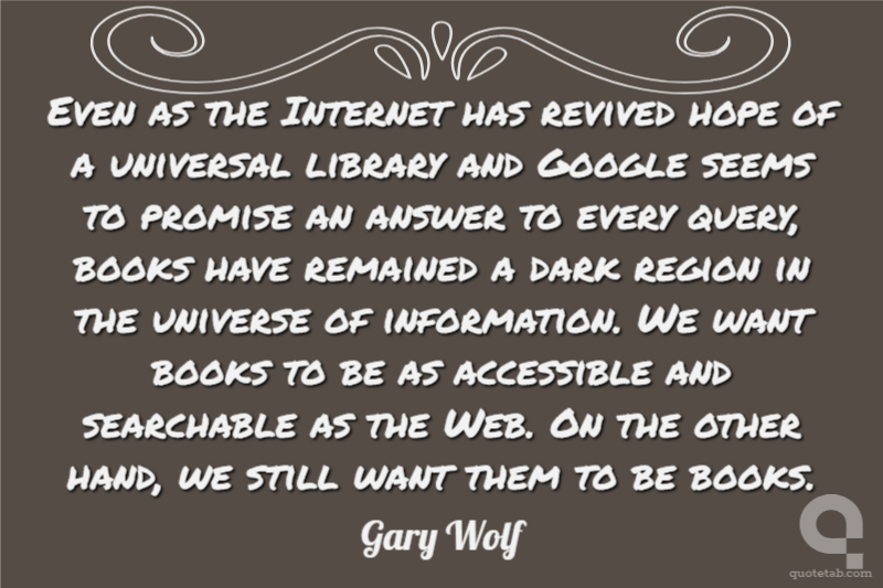 Even as the Internet has revived hope of a universal library and Google seems to promise an answer to every query, books have remained a dark region in the universe of information. We want books to be as accessible and searchable as the Web. On the other hand, we still want them to be books.