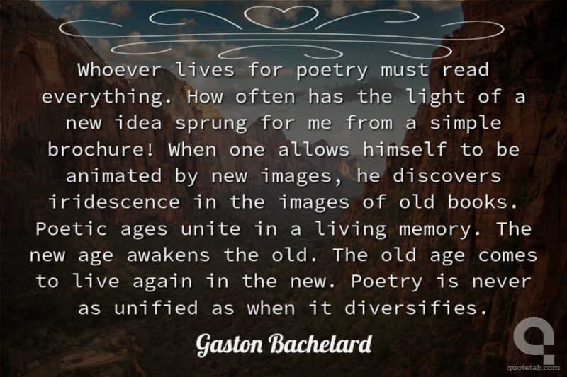 Whoever lives for poetry must read everything. How often has the light of a new idea sprung for me from a simple brochure! When one allows himself to be animated by new images, he discovers iridescence in the images of old books. Poetic ages unite in a living memory. The new age awakens the old. The old age comes to live again in the new. Poetry is never as unified as when it diversifies.