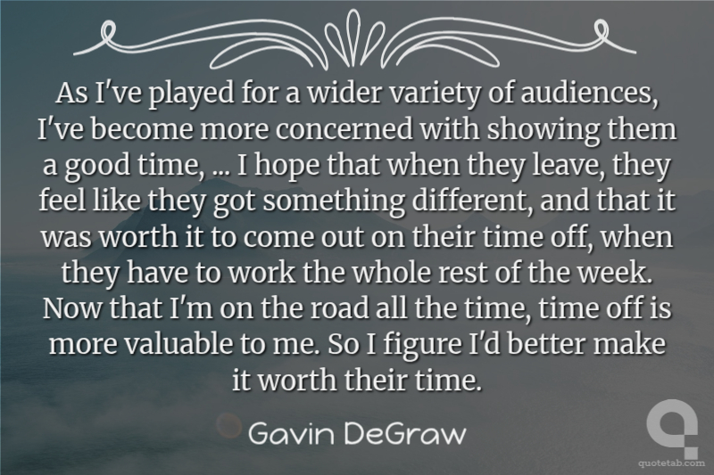 As I've played for a wider variety of audiences, I've become more concerned with showing them a good time, ... I hope that when they leave, they feel like they got something different, and that it was worth it to come out on their time off, when they have to work the whole rest of the week. Now that I'm on the road all the time, time off is more valuable to me. So I figure I'd better make it worth their time.