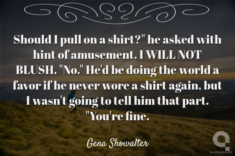 Should I pull on a shirt?" he asked with hint of amusement. I WILL NOT BLUSH. "No." He'd be doing the world a favor if he never wore a shirt again, but I wasn't going to tell him that part. "You're fine.