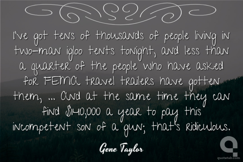 I've got tens of thousands of people living in two-man igloo tents tonight, and less than a quarter of the people who have asked for FEMA travel trailers have gotten them, ... And at the same time they can find $140,000 a year to pay this incompetent son of a gun; that's ridiculous.