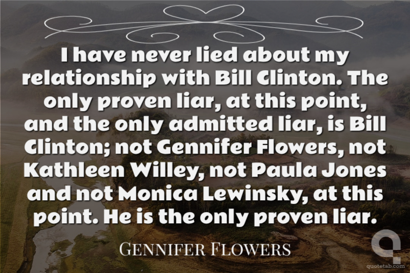 I have never lied about my relationship with Bill Clinton. The only proven liar, at this point, and the only admitted liar, is Bill Clinton; not Gennifer Flowers, not Kathleen Willey, not Paula Jones and not Monica Lewinsky, at this point. He is the only proven liar.