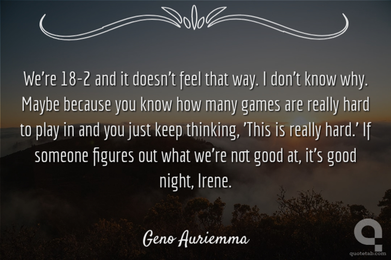 We're 18-2 and it doesn't feel that way. I don't know why. Maybe because you know how many games are really hard to play in and you just keep thinking, 'This is really hard.' If someone figures out what we're not good at, it's good night, Irene.