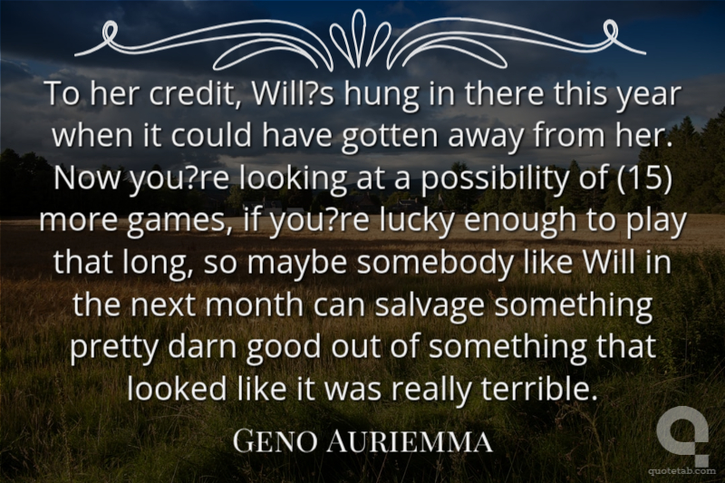 To her credit, Will?s hung in there this year when it could have gotten away from her. Now you?re looking at a possibility of (15) more games, if you?re lucky enough to play that long, so maybe somebody like Will in the next month can salvage something pretty darn good out of something that looked like it was really terrible.