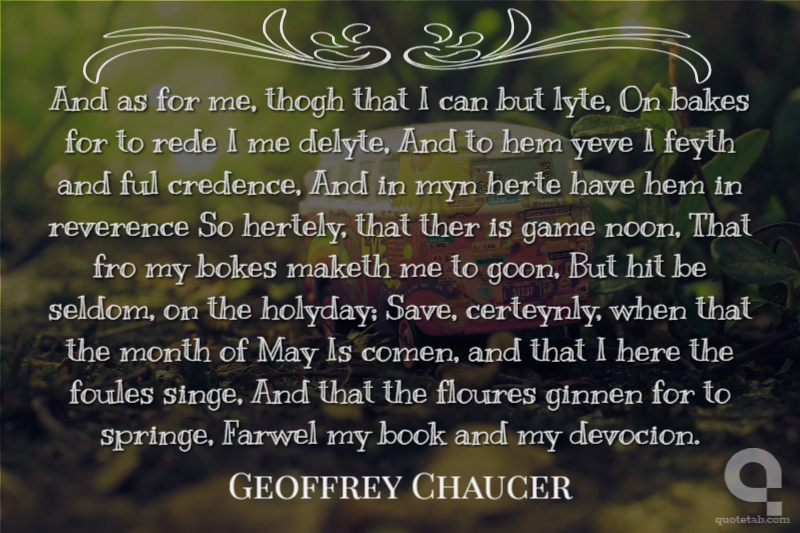 And as for me, thogh that I can but lyte, On bakes for to rede I me delyte, And to hem yeve I feyth and ful credence, And in myn herte have hem in reverence So hertely, that ther is game noon, That fro my bokes maketh me to goon, But hit be seldom, on the holyday; Save, certeynly, when that the month of May Is comen, and that I here the foules singe, And that the floures ginnen for to springe, Farwel my book and my devocion.