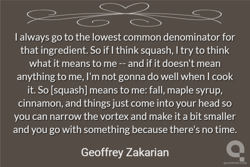 I always go to the lowest common denominator for that ingredient. So if I think squash, I try to think what it means to me -- and if it doesn't mean anything to me, I'm not gonna do well when I cook it. So [squash] means to me: fall, maple syrup, cinnamon, and things just come into your head so you can narrow the vortex and make it a bit smaller and you go with something because there's no time.