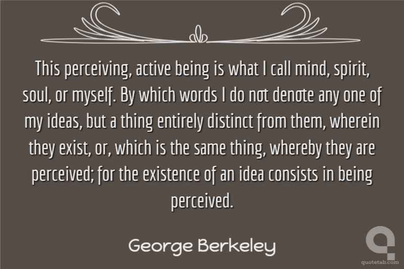 This perceiving, active being is what I call mind, spirit, soul, or myself. By which words I do not denote any one of my ideas, but a thing entirely distinct from them, wherein they exist, or, which is the same thing, whereby they are perceived; for the existence of an idea consists in being perceived.