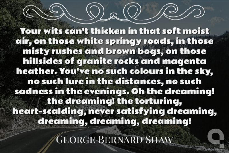 Your wits can't thicken in that soft moist air, on those white springy roads, in those misty rushes and brown bogs, on those hillsides of granite rocks and magenta heather. You've no such colours in the sky, no such lure in the distances, no such sadness in the evenings. Oh the dreaming! the dreaming! the torturing, heart-scalding, never satisfying dreaming, dreaming, dreaming, dreaming!