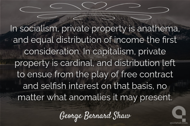 In socialism, private property is anathema, and equal distribution of income the first consideration. In capitalism, private property is cardinal, and distribution left to ensue from the play of free contract and selfish interest on that basis, no matter what anomalies it may present.