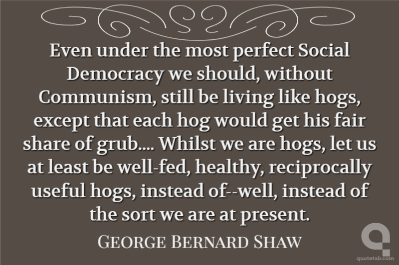Even under the most perfect Social Democracy we should, without Communism, still be living like hogs, except that each hog would get his fair share of grub.... Whilst we are hogs, let us at least be well-fed, healthy, reciprocally useful hogs, instead of--well, instead of the sort we are at present.