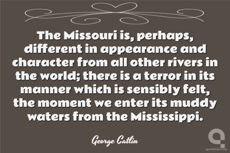 The Missouri is, perhaps, different in appearance and character from all other rivers in the world; there is a terror in its manner which is sensibly felt, the moment we enter its muddy waters from the Mississippi.