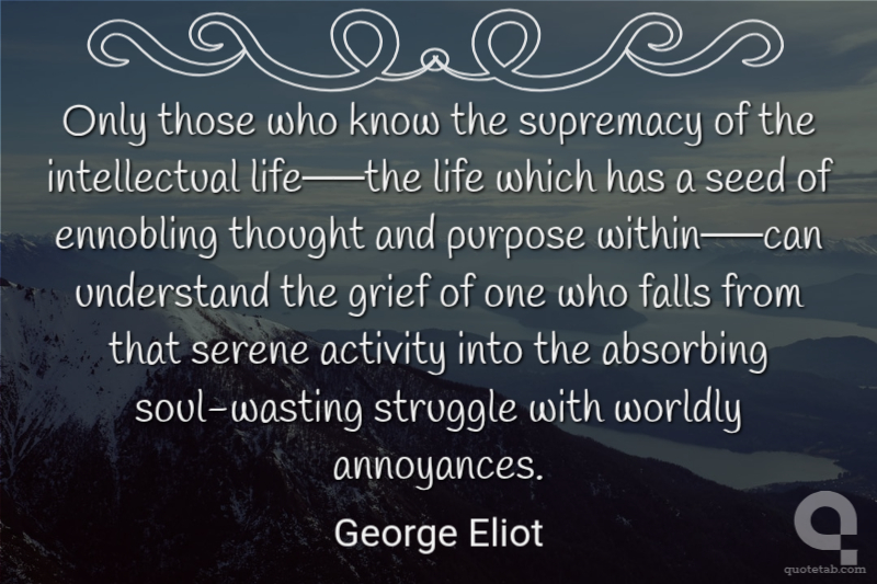 Only those who know the supremacy of the intellectual life──the life which has a seed of ennobling thought and purpose within──can understand the grief of one who falls from that serene activity into the absorbing soul-wasting struggle with worldly annoyances.