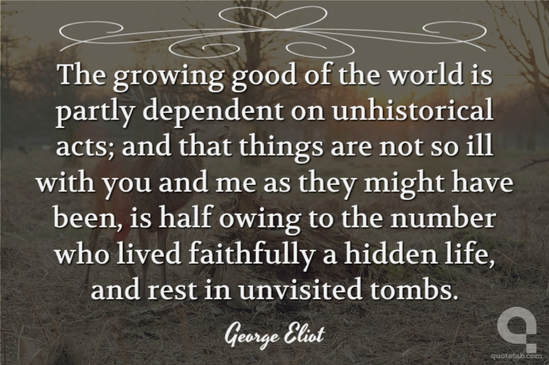 The growing good of the world is partly dependent on unhistorical acts; and that things are not so ill with you and me as they might have been, is half owing to the number who lived faithfully a hidden life, and rest in unvisited tombs.