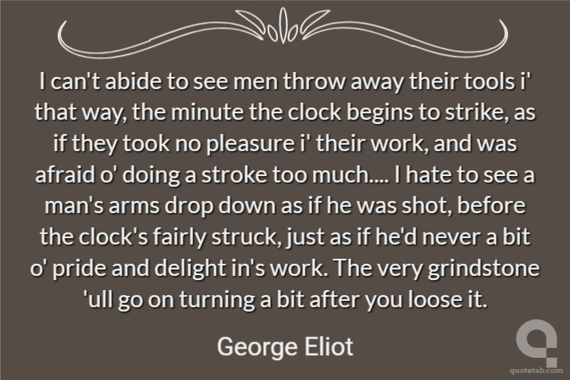 I can't abide to see men throw away their tools i' that way, the minute the clock begins to strike, as if they took no pleasure i' their work, and was afraid o' doing a stroke too much.... I hate to see a man's arms drop down as if he was shot, before the clock's fairly struck, just as if he'd never a bit o' pride and delight in's work. The very grindstone 'ull go on turning a bit after you loose it.