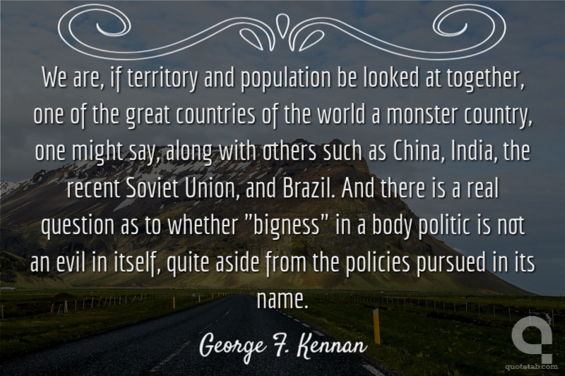 We are, if territory and population be looked at together, one of the great countries of the world a monster country, one might say, along with others such as China, India, the recent Soviet Union, and Brazil. And there is a real question as to whether "bigness" in a body politic is not an evil in itself, quite aside from the policies pursued in its name.