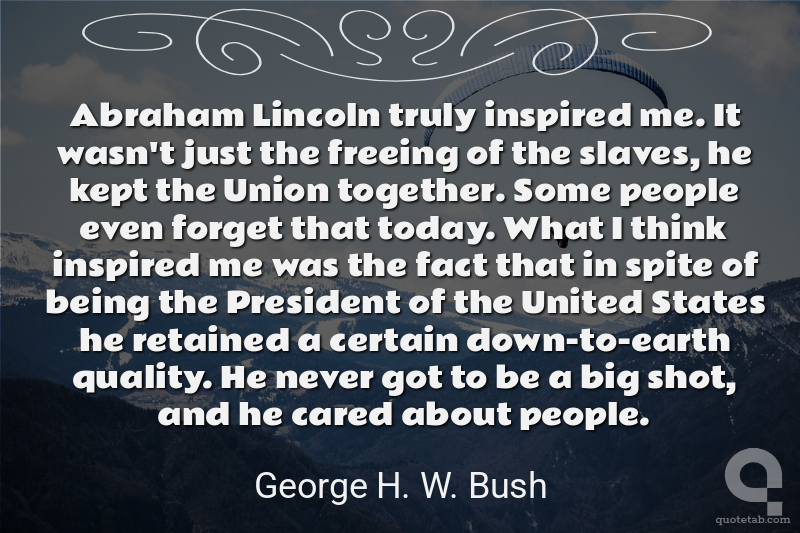Abraham Lincoln truly inspired me. It wasn't just the freeing of the slaves, he kept the Union together. Some people even forget that today. What I think inspired me was the fact that in spite of being the President of the United States he retained a certain down-to-earth quality. He never got to be a big shot, and he cared about people.