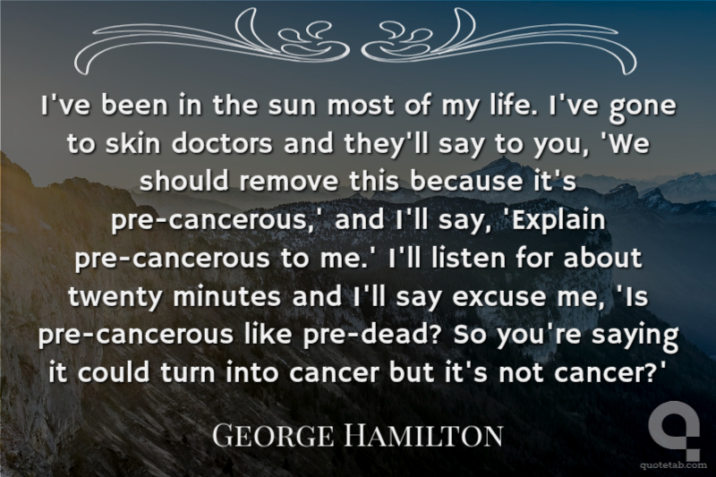 I've been in the sun most of my life. I've gone to skin doctors and they'll say to you, 'We should remove this because it's pre-cancerous,' and I'll say, 'Explain pre-cancerous to me.' I'll listen for about twenty minutes and I'll say excuse me, 'Is pre-cancerous like pre-dead? So you're saying it could turn into cancer but it's not cancer?'