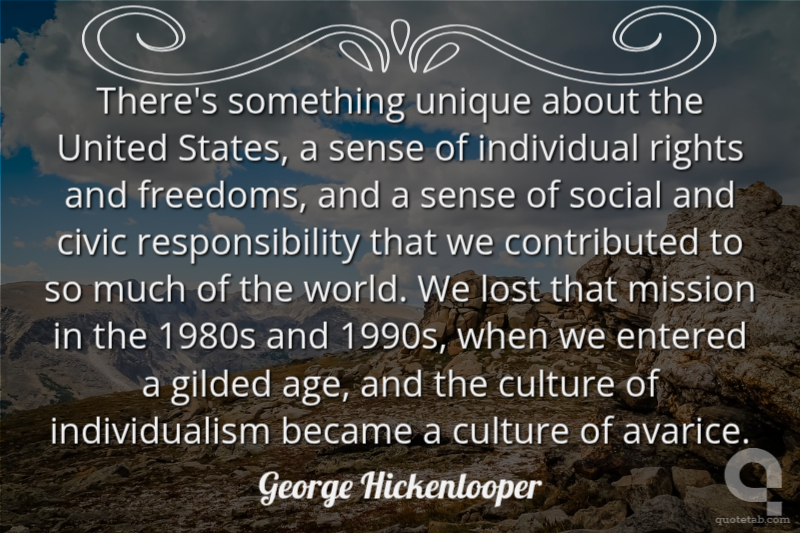 There's something unique about the United States, a sense of individual rights and freedoms, and a sense of social and civic responsibility that we contributed to so much of the world. We lost that mission in the 1980s and 1990s, when we entered a gilded age, and the culture of individualism became a culture of avarice.