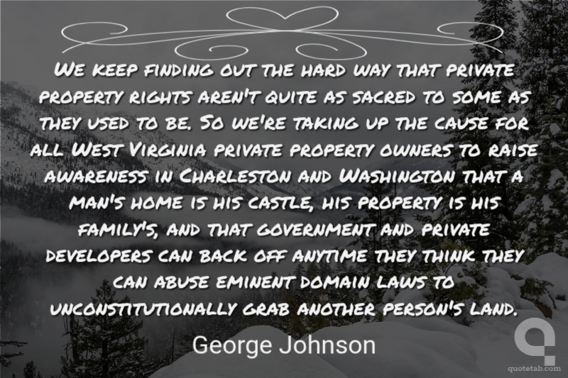 We keep finding out the hard way that private property rights aren't quite as sacred to some as they used to be. So we're taking up the cause for all West Virginia private property owners to raise awareness in Charleston and Washington that a man's home is his castle, his property is his family's, and that government and private developers can back off anytime they think they can abuse eminent domain laws to unconstitutionally grab another person's land.