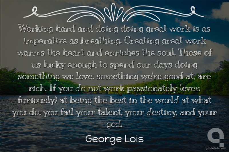 Working hard and doing doing great work is as imperative as breathing. Creating great work warms the heart and enriches the soul. Those of us lucky enough to spend our days doing something we love, something we're good at, are rich. If you do not work passionately (even furiously) at being the best in the world at what you do, you fail your talent, your destiny, and your god.