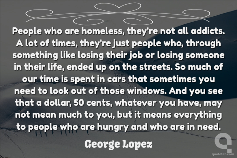 People who are homeless, they're not all addicts. A lot of times, they're just people who, through something like losing their job or losing someone in their life, ended up on the streets. So much of our time is spent in cars that sometimes you need to look out of those windows. And you see that a dollar, 50 cents, whatever you have, may not mean much to you, but it means everything to people who are hungry and who are in need.