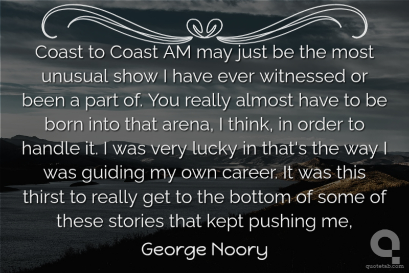 Coast to Coast AM may just be the most unusual show I have ever witnessed or been a part of. You really almost have to be born into that arena, I think, in order to handle it. I was very lucky in that's the way I was guiding my own career. It was this thirst to really get to the bottom of some of these stories that kept pushing me,