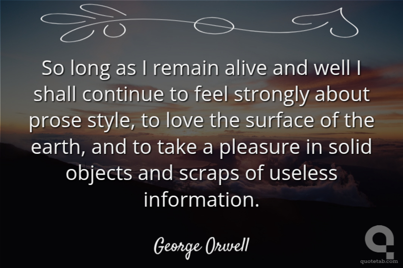 So long as I remain alive and well I shall continue to feel strongly about prose style, to love the surface of the earth, and to take a pleasure in solid objects and scraps of useless information.