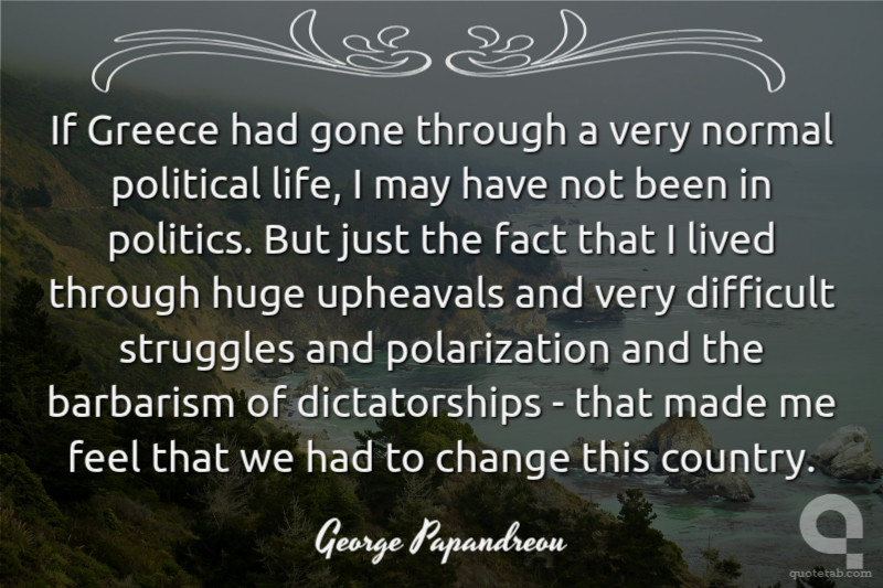 If Greece had gone through a very normal political life, I may have not been in politics. But just the fact that I lived through huge upheavals and very difficult struggles and polarization and the barbarism of dictatorships - that made me feel that we had to change this country.