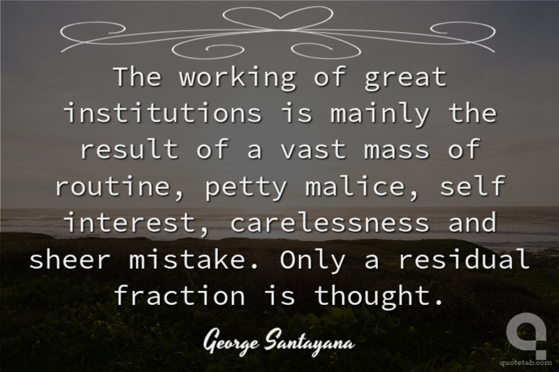 The working of great institutions is mainly the result of a vast mass of routine, petty malice, self interest, carelessness and sheer mistake. Only a residual fraction is thought.