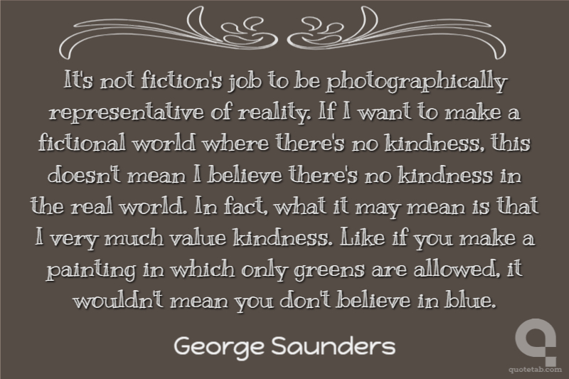 It's not fiction's job to be photographically representative of reality. If I want to make a fictional world where there's no kindness, this doesn't mean I believe there's no kindness in the real world. In fact, what it may mean is that I very much value kindness. Like if you make a painting in which only greens are allowed, it wouldn't mean you don't believe in blue.