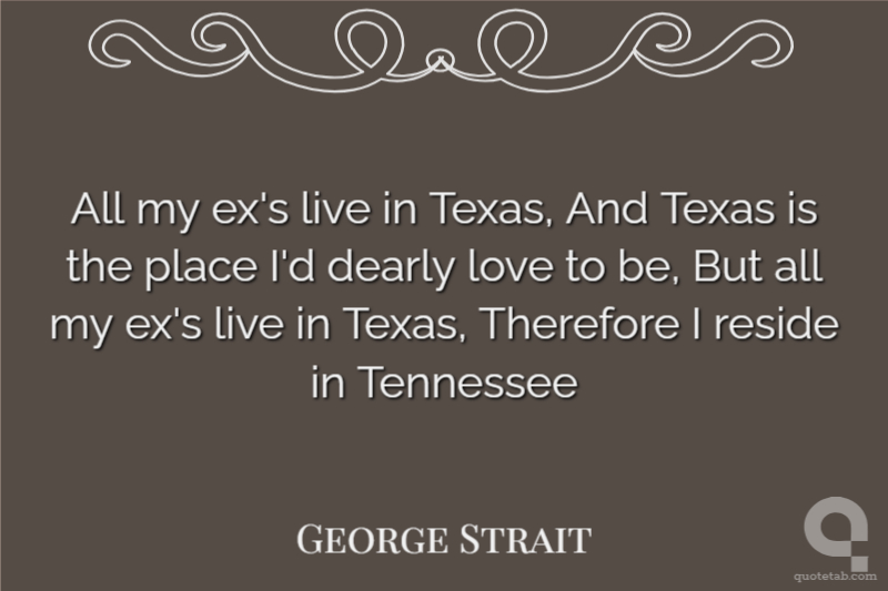 All my ex's live in Texas, And Texas is the place I'd dearly love to be, But all my ex's live in Texas, Therefore I reside in Tennessee