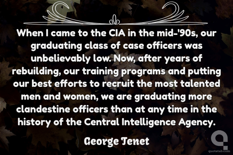 When I came to the CIA in the mid-'90s, our graduating class of case officers was unbelievably low. Now, after years of rebuilding, our training programs and putting our best efforts to recruit the most talented men and women, we are graduating more clandestine officers than at any time in the history of the Central Intelligence Agency.