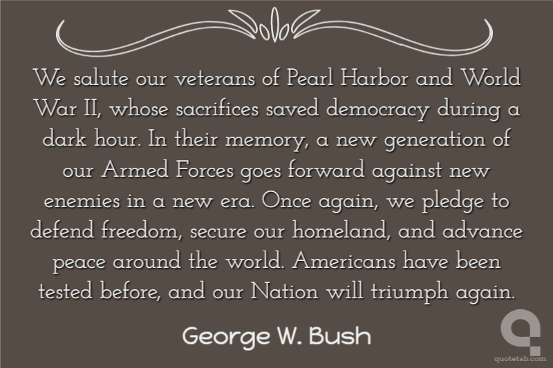 We salute our veterans of Pearl Harbor and World War II, whose sacrifices saved democracy during a dark hour. In their memory, a new generation of our Armed Forces goes forward against new enemies in a new era. Once again, we pledge to defend freedom, secure our homeland, and advance peace around the world. Americans have been tested before, and our Nation will triumph again.
