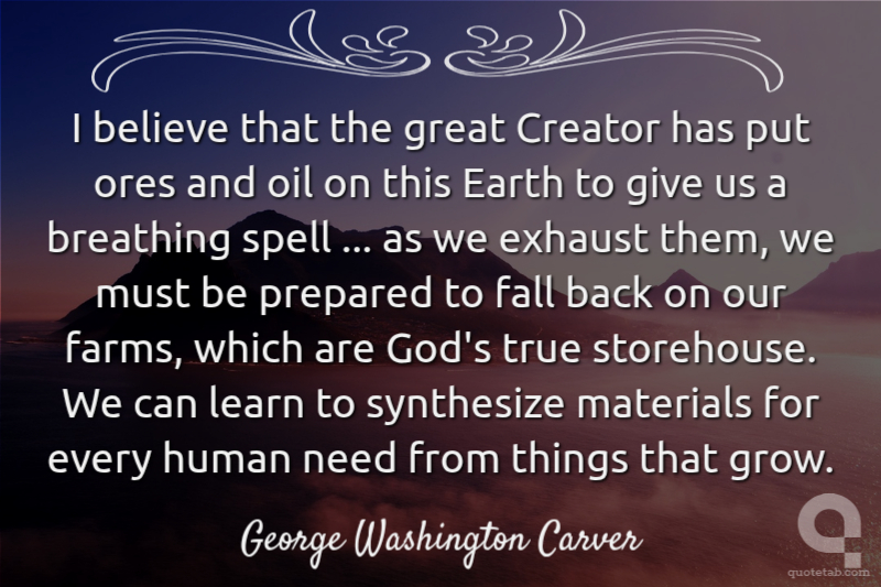 I believe that the great Creator has put ores and oil on this Earth to give us a breathing spell ... as we exhaust them, we must be prepared to fall back on our farms, which are God's true storehouse. We can learn to synthesize materials for every human need from things that grow.