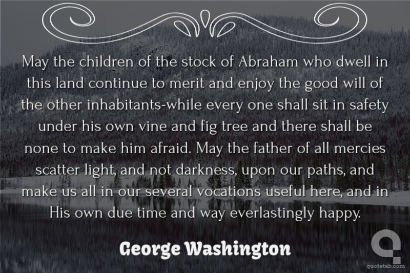 May the children of the stock of Abraham who dwell in this land continue to merit and enjoy the good will of the other inhabitants-while every one shall sit in safety under his own vine and fig tree and there shall be none to make him afraid. May the father of all mercies scatter light, and not darkness, upon our paths, and make us all in our several vocations useful here, and in His own due time and way everlastingly happy.