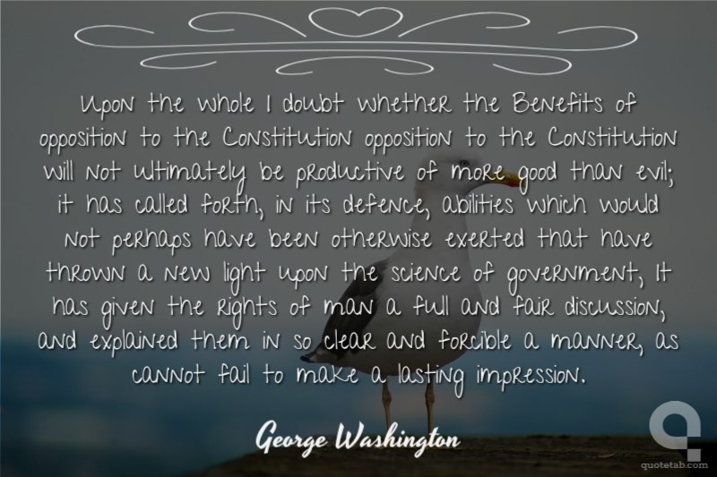 Upon the whole I doubt whether the Benefits of opposition to the Constitution opposition to the Constitution will not ultimately be productive of more good than evil; it has called forth, in its defence, abilities which would not perhaps have been otherwise exerted that have thrown a new light upon the science of government, It has given the rights of man a full and fair discussion, and explained them in so clear and forcible a manner, as cannot fail to make a lasting impression.