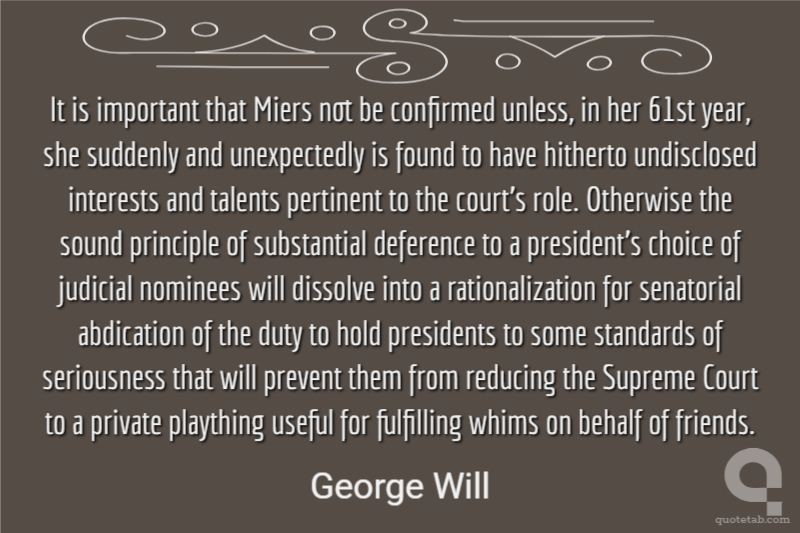 It is important that Miers not be confirmed unless, in her 61st year, she suddenly and unexpectedly is found to have hitherto undisclosed interests and talents pertinent to the court's role. Otherwise the sound principle of substantial deference to a president's choice of judicial nominees will dissolve into a rationalization for senatorial abdication of the duty to hold presidents to some standards of seriousness that will prevent them from reducing the Supreme Court to a private plaything useful for fulfilling whims on behalf of friends.