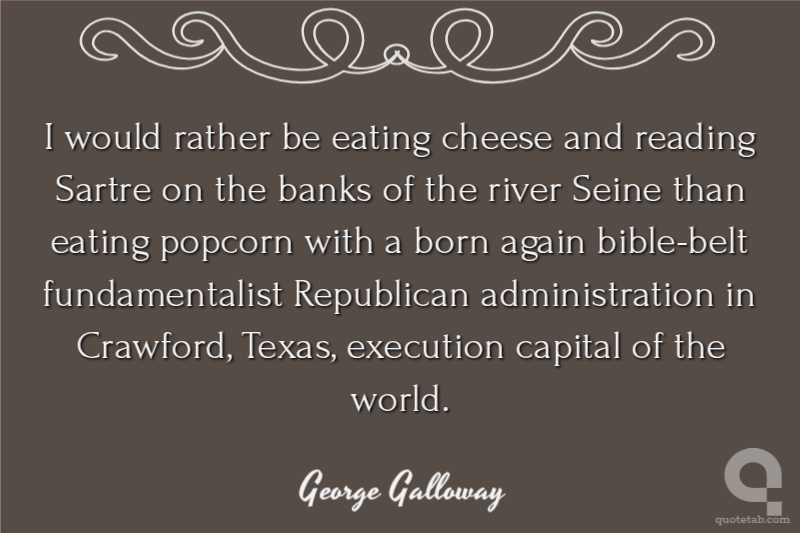 I would rather be eating cheese and reading Sartre on the banks of the river Seine than eating popcorn with a born again bible-belt fundamentalist Republican administration in Crawford, Texas, execution capital of the world.
