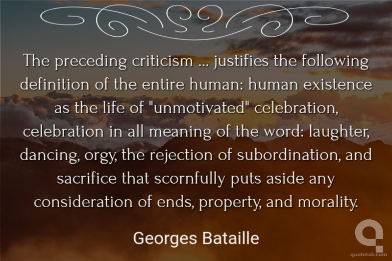 The preceding criticism ... justifies the following definition of the entire human: human existence as the life of "unmotivated" celebration, celebration in all meaning of the word: laughter, dancing, orgy, the rejection of subordination, and sacrifice that scornfully puts aside any consideration of ends, property, and morality.