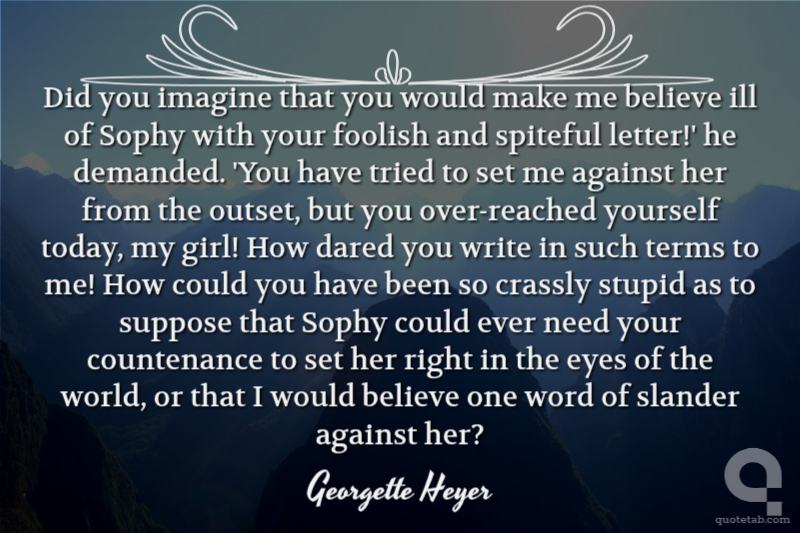Did you imagine that you would make me believe ill of Sophy with your foolish and spiteful letter!' he demanded. 'You have tried to set me against her from the outset, but you over-reached yourself today, my girl! How dared you write in such terms to me! How could you have been so crassly stupid as to suppose that Sophy could ever need your countenance to set her right in the eyes of the world, or that I would believe one word of slander against her?