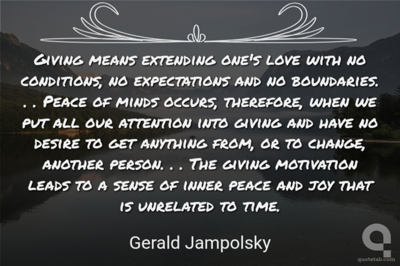 Giving means extending one's love with no conditions, no expectations and no boundaries. . . Peace of minds occurs, therefore, when we put all our attention into giving and have no desire to get anything from, or to change, another person. . . The giving motivation leads to a sense of inner peace and joy that is unrelated to time.