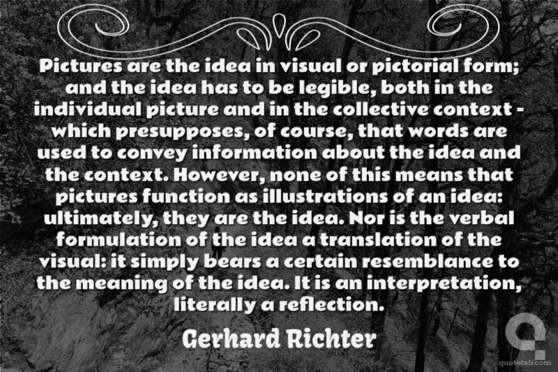Pictures are the idea in visual or pictorial form; and the idea has to be legible, both in the individual picture and in the collective context - which presupposes, of course, that words are used to convey information about the idea and the context. However, none of this means that pictures function as illustrations of an idea: ultimately, they are the idea. Nor is the verbal formulation of the idea a translation of the visual: it simply bears a certain resemblance to the meaning of the idea. It is an interpretation, literally a reflection.