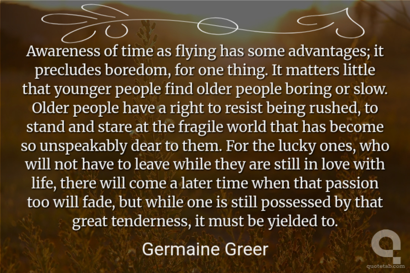 Awareness of time as flying has some advantages; it precludes boredom, for one thing. It matters little that younger people find older people boring or slow. Older people have a right to resist being rushed, to stand and stare at the fragile world that has become so unspeakably dear to them. For the lucky ones, who will not have to leave while they are still in love with life, there will come a later time when that passion too will fade, but while one is still possessed by that great tenderness, it must be yielded to.