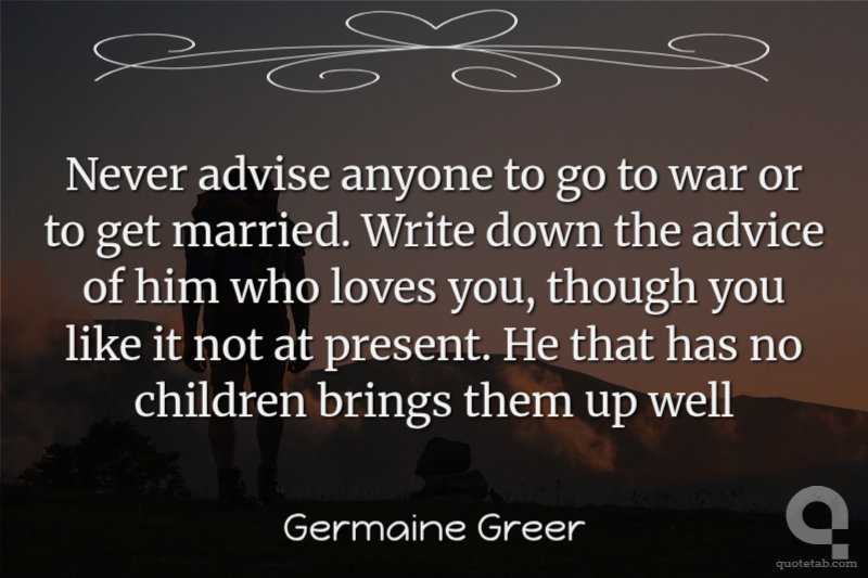 Never advise anyone to go to war or to get married. Write down the advice of him who loves you, though you like it not at present. He that has no children brings them up well