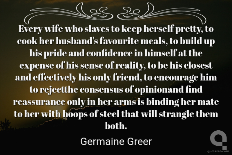 Every wife who slaves to keep herself pretty, to cook her husband's favourite meals, to build up his pride and confidence in himself at the expense of his sense of reality, to be his closest and effectively his only friend, to encourage him to rejectthe consensus of opinionand find reassurance only in her arms is binding her mate to her with hoops of steel that will strangle them both.